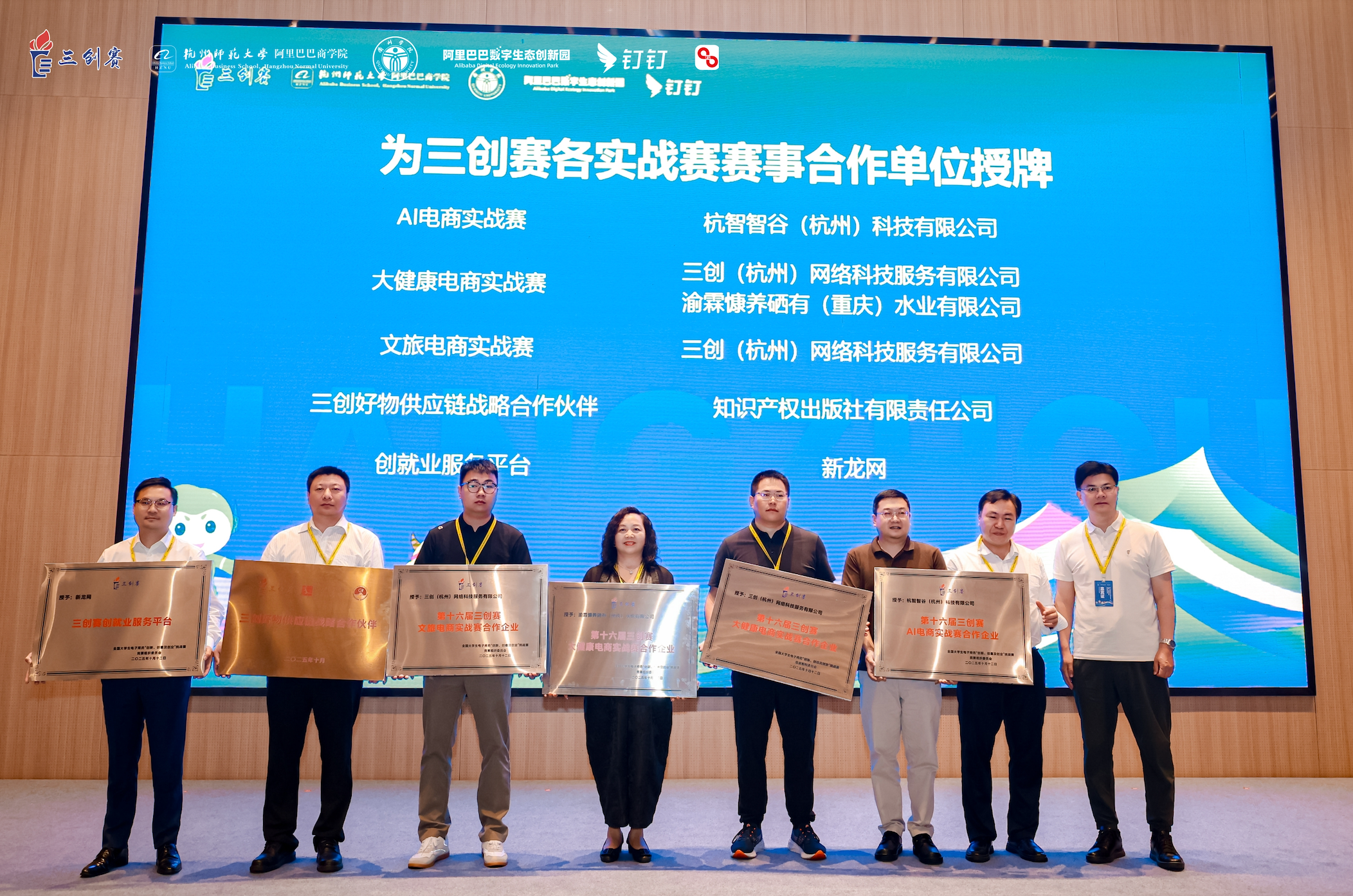 随后,三创赛合作企业代表新龙网总裁何振阳、钉钉科教行业总经理冯登伟、全国电子商务产教融合创新联盟副理事长、三创(杭州)网络科技服务有限公司总经理游文超等企业负责人也出席并分享了与三创赛的合作愿景。他们表示,AI与数字技术正重塑大学教育,成为培养数字素养与创新能力的核心驱动力,他们将深度开放其核心的技术生态与商业平台,为赛事提供从AI算力、开发工具到云资源的全链路技术支持,助力参赛团队解决实际问题,推动创新项目从 “创意” 走向 “市场”。